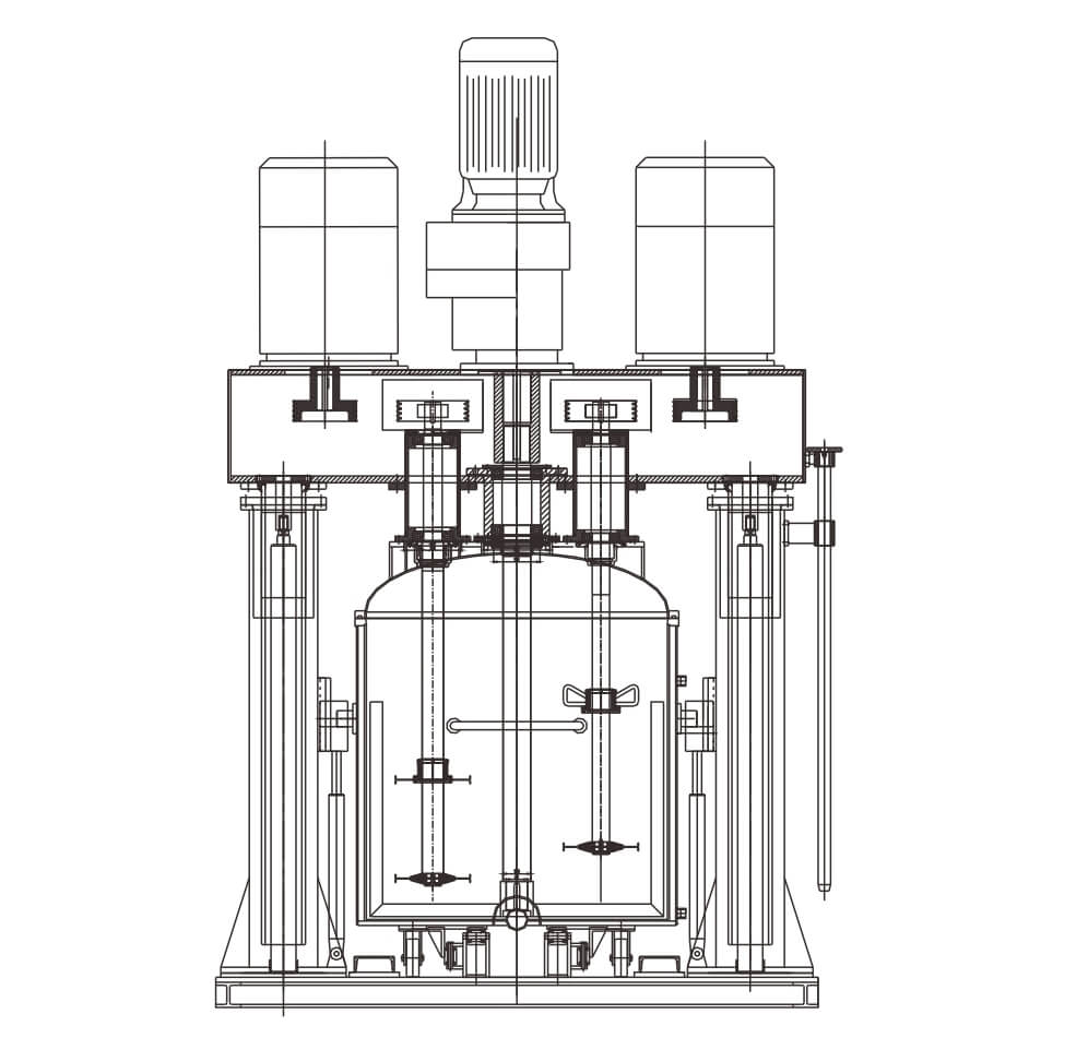强力分散机有三个电动机,釜内有三根不同形式的搅拌器,其中一个搅拌器在绕釜体轴线转动,其余两个搅拌装置又以不同的转速,绕自身轴线高速自转,使物料在釜内作复杂的运动,受到强烈的剪切和搓合。机器设备内山形刮刀绕釜体轴线转动,将粘在壁上和底部的原料刮出,使其效果更为理想。设备密封性好,可抽真空,具有良好的排气除泡效果。设备缸盖可液压升降,缸体可自由移动,操作十分方便。搅拌器的形式,根据物料要求可为多层桨叶式、框式、蝴蝶式、叶轮式等。通常采用变频调速,以满足各种工艺要求。